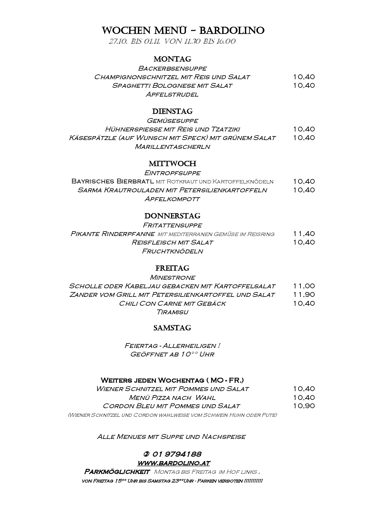 Bitte Beachten Sie dass die Parkplätze in der Zeit von Freitag 15 Uhr bis Samstag 23 Uhr für die naheliegende Kirche gesperrt sind. Wir entschuldigen diese Umstände und bitten Sie eine alternative Parkmöglichkeit zu suchen.
